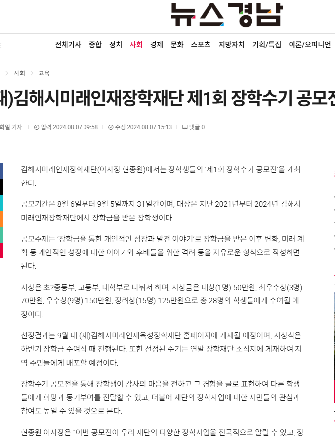공모기간은 8월 5일부터 9월 1일까지 27일간이며, 대상은 지난 2021년부터 2024년 김해시미래인재장학재단에서 장학금을 받은 장학생이다.