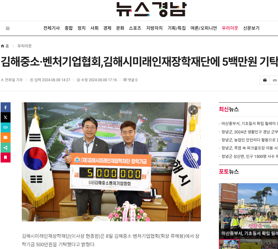 김해시미래인재장학재단(이사장 현종원)은 8일 김해중소·벤처기업협회(회장 류해용)에서 장학기금 500만원을 기탁했다고 밝혔다.